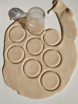 2. Con el vaso circular marca las circunferencias que necesites (en este caso són 5, nosotras hicimos más ya que aprovechamos para hacer otro móvil de la luna y sus fases) retira la pasta sobrante.